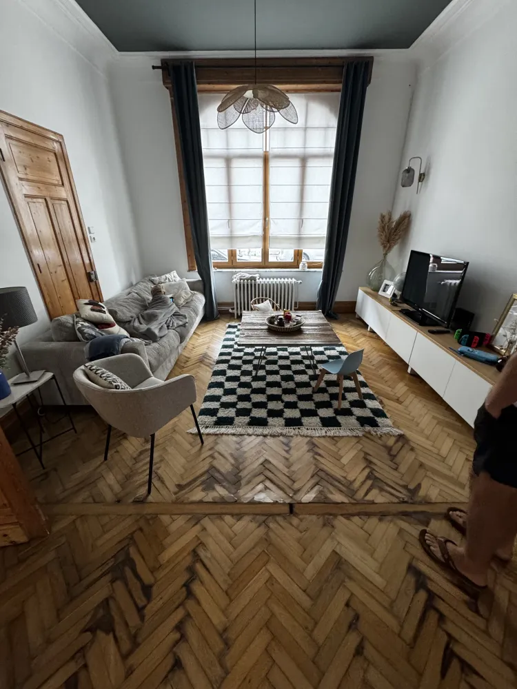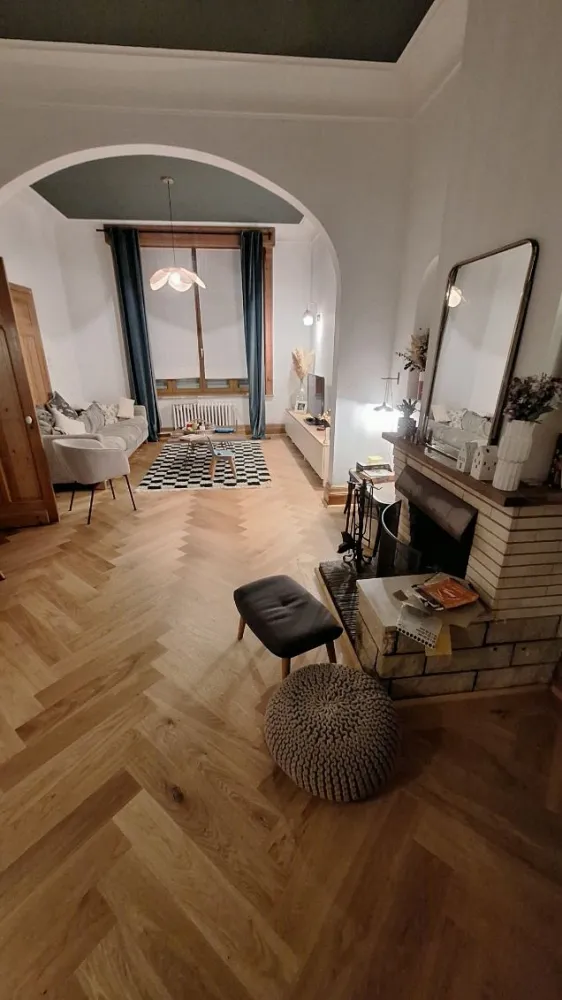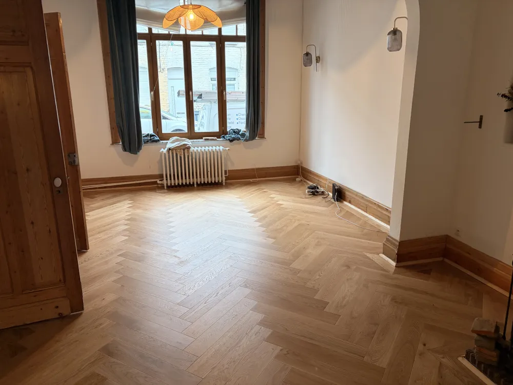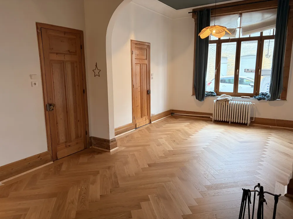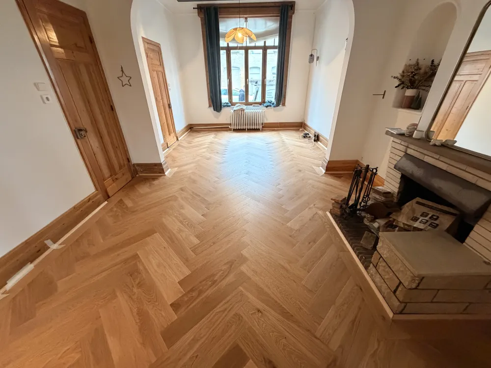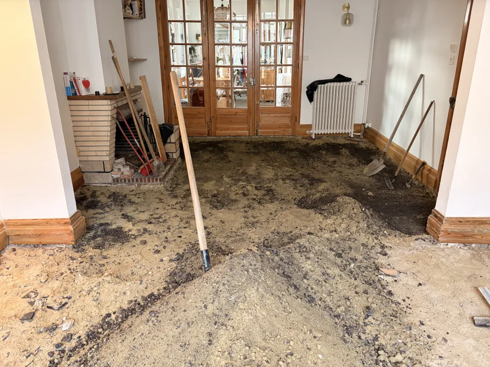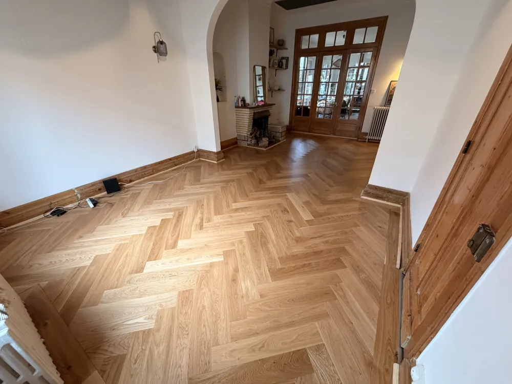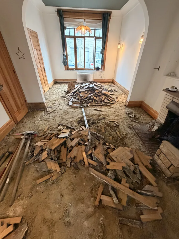 Comme beaucoup de parquet bois dans ces maisons et de ces année la le parquet gonfle devient noir et bouge car l’humidité avec les années à faire disparaître la Colle goudron.du coup Demontage et évacuation du parquet décapage de la chape sable jusqu’au sol dur.on repart dur une base seine avec la pose dune bâche plastique spécifique pour stopper les remonté la pose d’un joint mousse périphérique pour la dilatation et pour finir une chape nickel et de niveau avant la pose du nouveau parquet bâton rompu